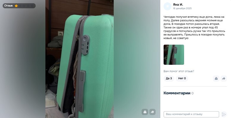 • Тевин: молнию пришивают дешёвыми нитками, низкой плотности шов. Чемодан набит — и шов сдаёт позиции; при перегрузе молния просто отрывается вместе с лентой